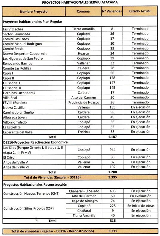 Reconstrucción en Atacama: SERVIU Desvincula a Empresas por Ineficiencia e incumplimientos reiterados El SERVIU Región de Atacama, unidad técnica del Ministerio de Vivienda y Urbanismo, que operativiza el proceso de reconstrucción regional, desvinculó a empresas que han sido ineficientes e incumplido reiteradamente con sus compromisos. La medida se ha adoptado debido a deficiente calidad de las obras, lento avance de trabajos en relación al tiempo transcurrido, y en el caso de Viviendas Chile por no concretar las obligaciones adoptadas con el SERVIU y en definitiva con la comunidad afectada por los aluviones de 2015. |