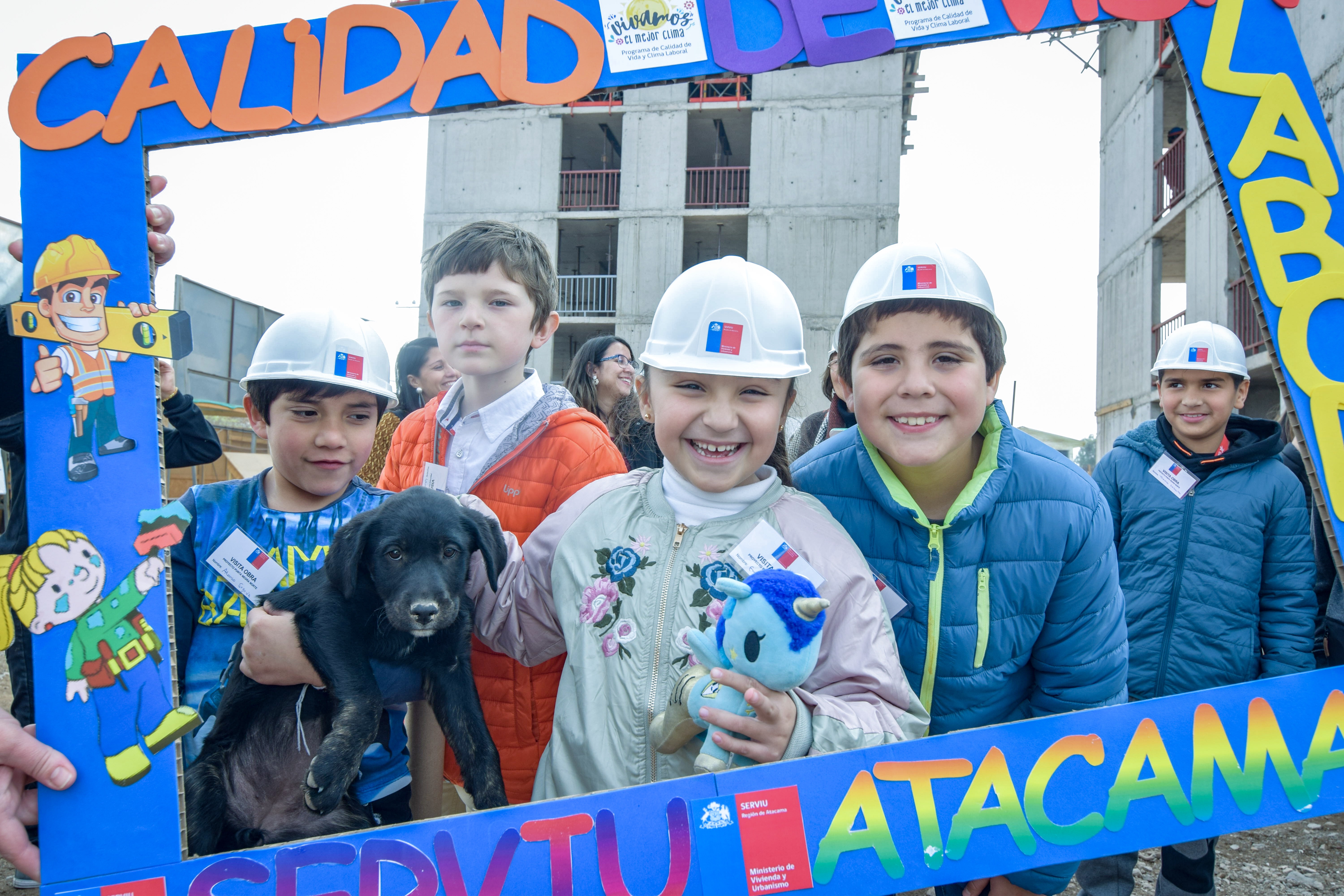 Plan de Calidad de Vida Laboral organizó un "Mini" Serviu Atacama en TerrenoUna maravillosa jornada vivieron hijos y sobrinos de los funcionarios del Serviu Región de Atacama, durante la visita a obra del proyecto de 220 departamentos "Punta Negra Norte", en Copiapó; enmarcada en el Plan de Calidad de Vida Laboral, temática Conciliación de Vida Personal y Familiar con el Trabajo. Los pequeños pudieron conocer un poco más de las labores que se realizan en el Serviu Atacama al recorrer esta obra ejecutada por la empresa constructora LOGA y financiada el Ministerio de Vivienda y Urbanismo del Gobierno de Chile. |