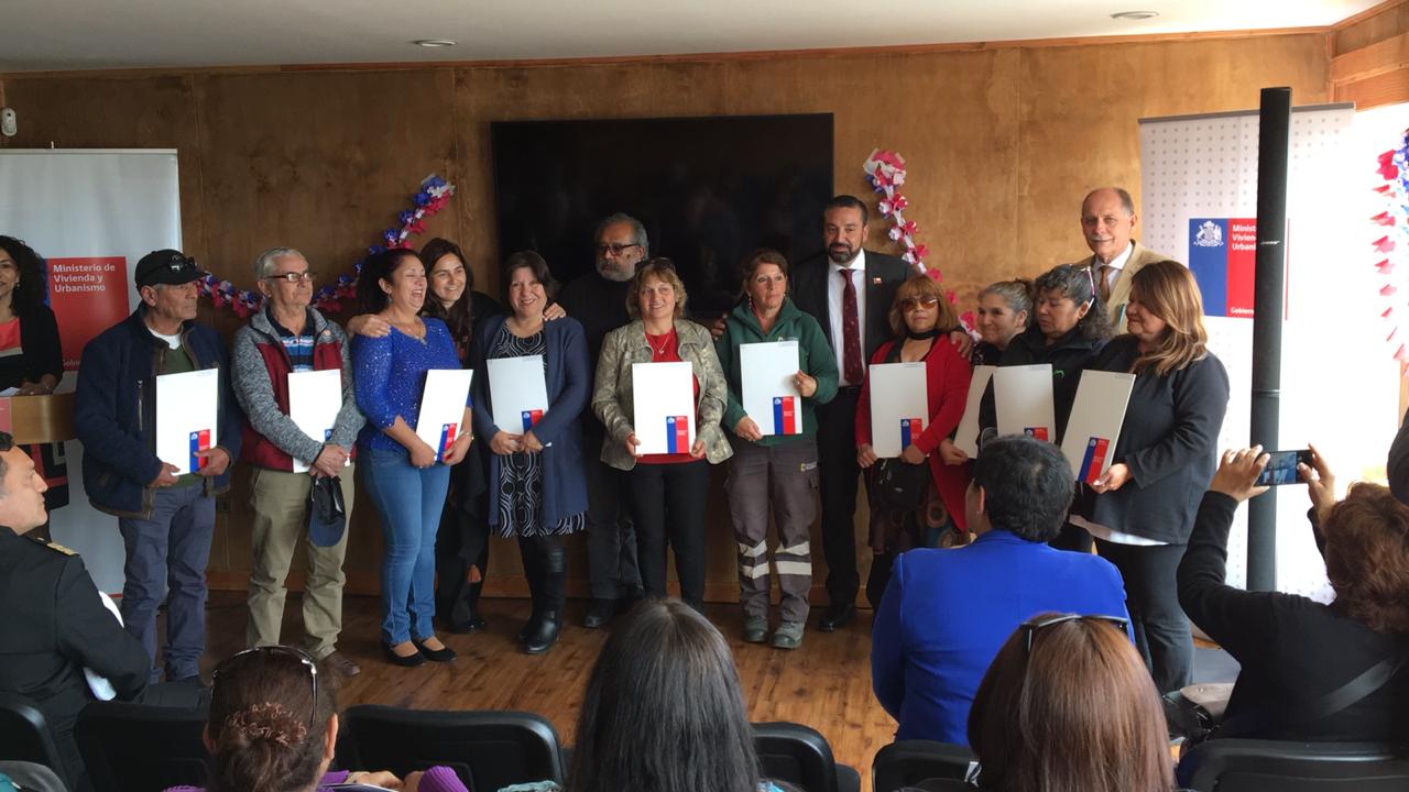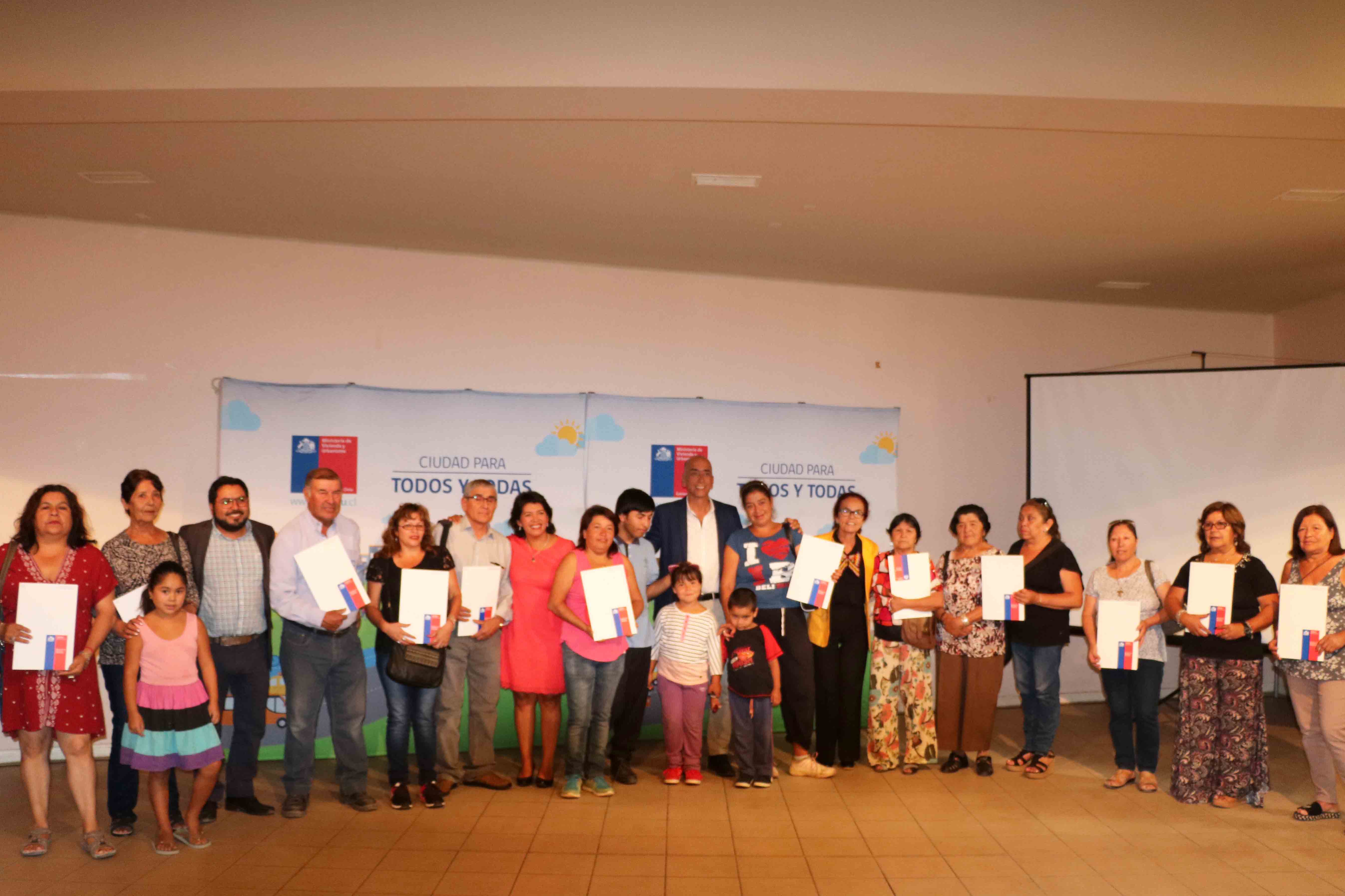 Minvu entrega 147 títulos de dominio En el Centro Cultural Estación de Caldera, se efectuó la ceremonia de entrega de 147 títulos de dominio a 39 familias del conjunto habitacional "Alborada Joven" y a 98 de "Caminando a un Sueño", actual Villa Padre Negro; beneficiarios del Fondo Solidario de Elección de Vivienda del Ministerio de Vivienda y Urbanismo. |