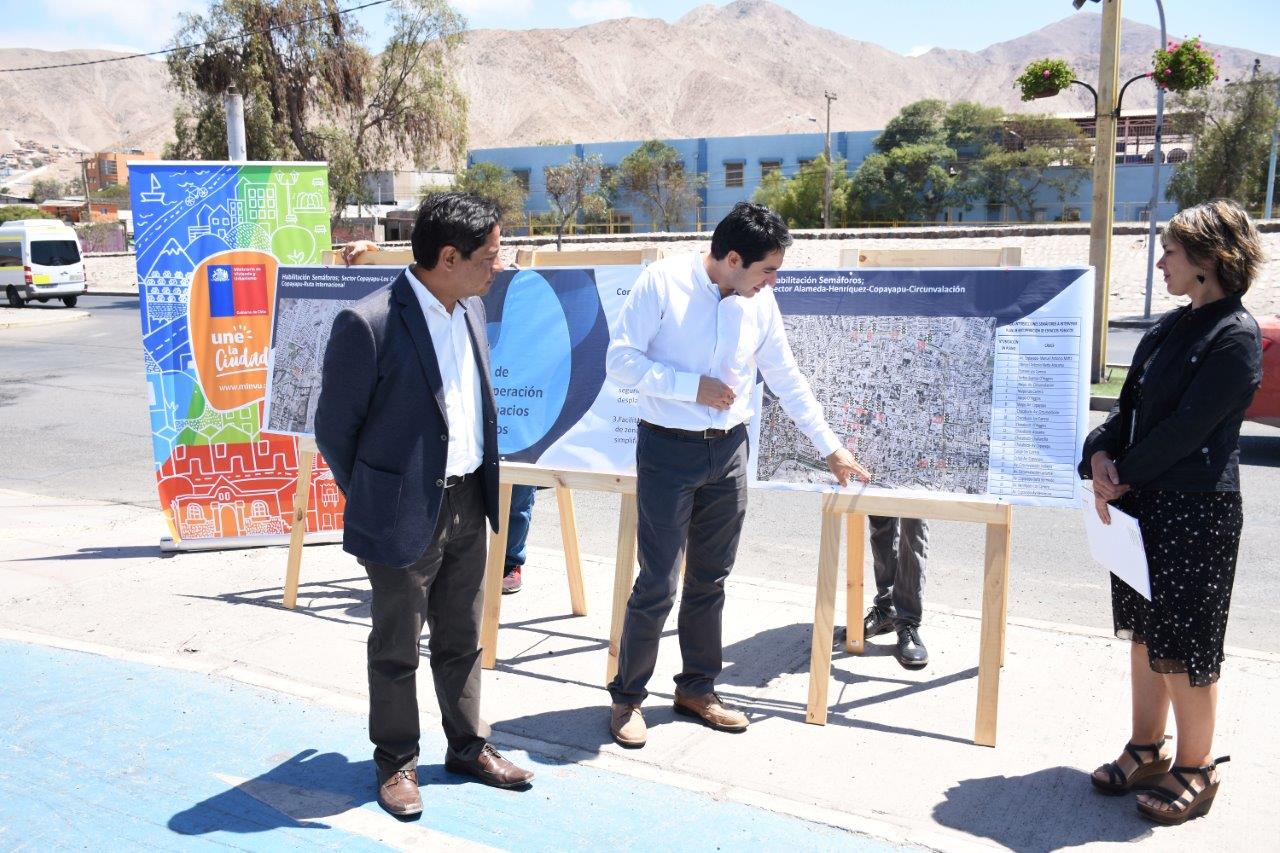 GOBIERNO REPONDRÁ SEMÁFOROS EN 28 INTERSECCIONES DE LA COMUNA DE COPIAPÓEn la esquina de Av. Circunvalación con calle Vallejo, uno de los puntos más complejos del tránsito copiapino, por la falta de semaforización dejados por desórdenes ciudadanos, el Intendente de Atacama, Patricio Urquieta; la SEREMI MINVU (S), Rocío Díaz; y el Director SERVIU Atacama, Rodrigo Maturana, anunciaron el plan que repondrá este mobiliario en 28 intersecciones de la capital regional. |