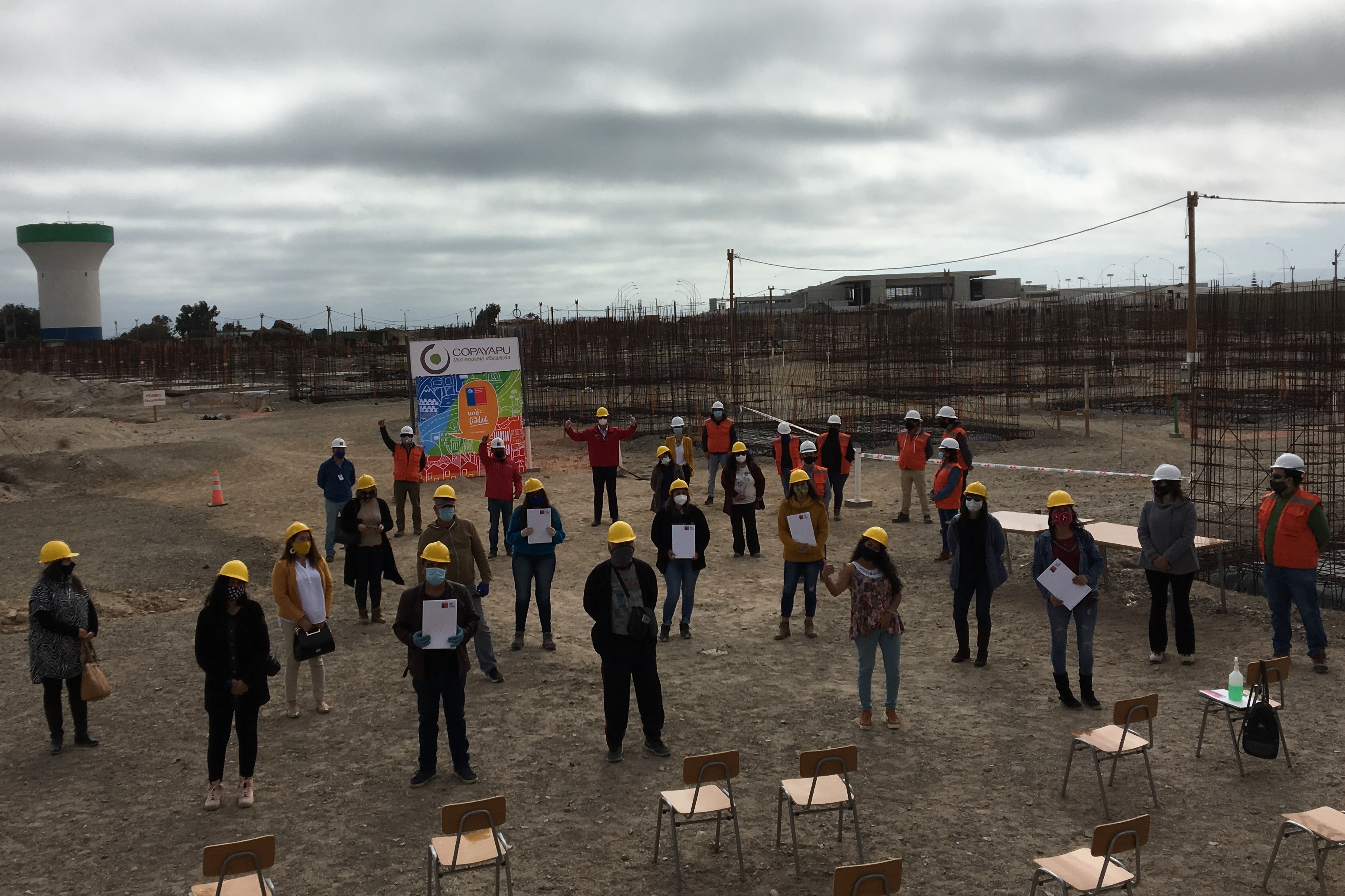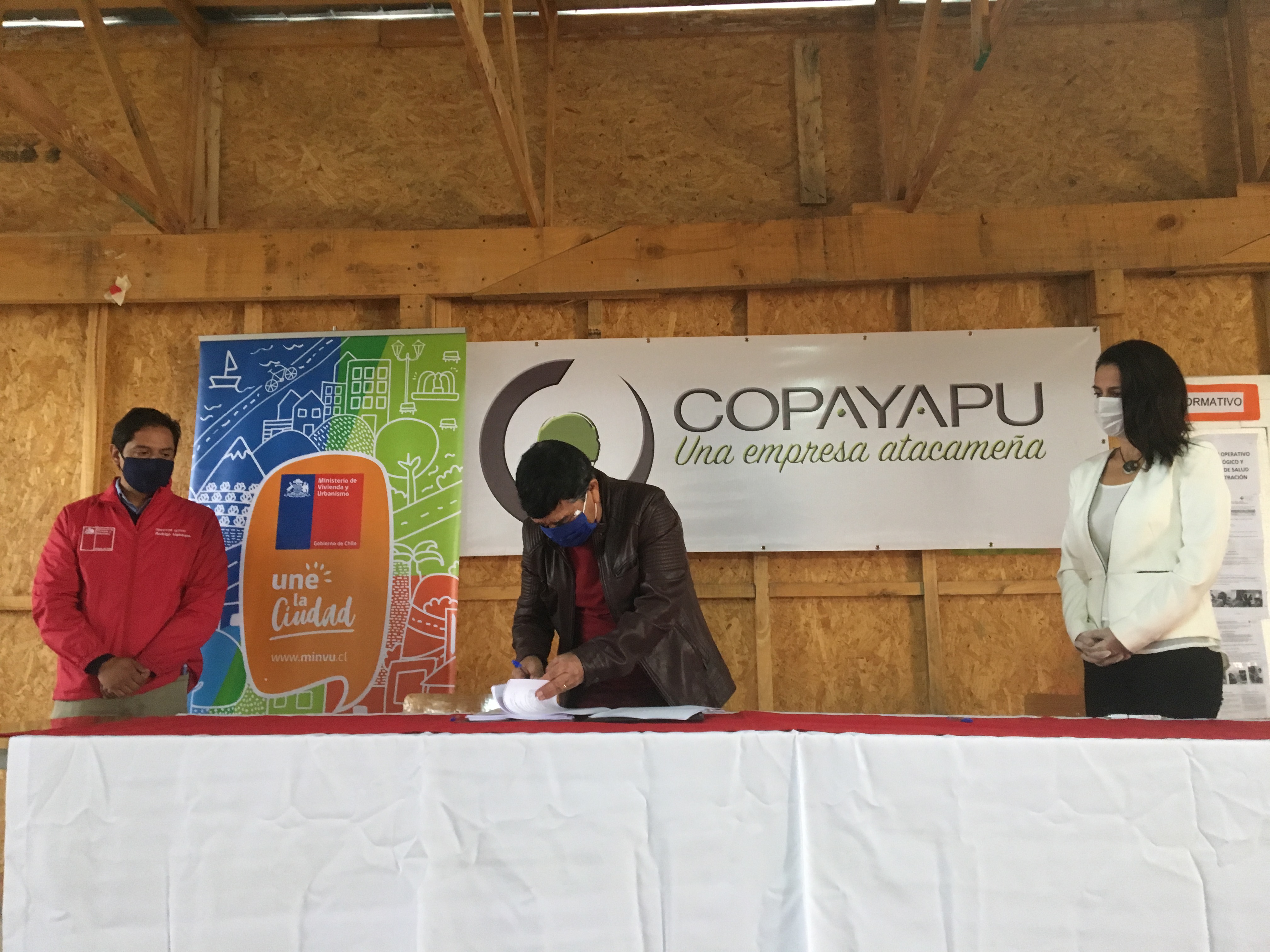 Con la entrega de terreno se reinició la obra "Copa de Agua" en CalderaCon mucha emoción y siguiendo las recomendaciones de la autoridad sanitaria, las directivas de los comités habitacionales "Bicentenario", "Alcanzando un Sueño", "William Wheelright", "Villa Alegre" y "Hogar Dulce Hogar"; el SEREMI Minvu, Pedro Ríos; el Director del Serviu Atacama, Rodrigo Maturana; y la socia y representante legal de la Inmobiliaria Copayapu, Sol Pardo; firmaron el acta de entrega de terreno, hito con el que se reinicia las obras de construcción del proyecto DS49 del Ministerio de Vivienda y Urbanismo "Copa de Agua I", que beneficia a 198 familias de la comuna de Caldera. |