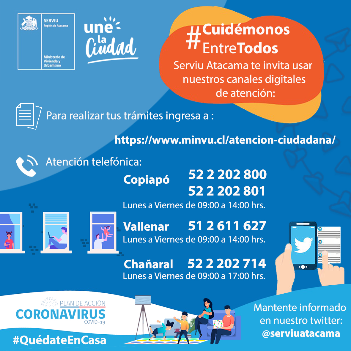 Serviu Atacama habilita nuevas vías de comunicación por Plan Coronavirus El Director del Serviu Atacama, Rodrigo Maturana Fuentes, informó que, en el marco del Plan Coronavirus, liderado por el Gobierno de Chile; el Servicio de Vivienda y Urbanización continúa trabajando de manera presencial, telefónica y virtual; especialmente, luego de la decisión del Ministerio de Vivienda y Urbanismo de suspender la atención de público en las OIRS de todo el país, para evitar aglomeraciones y resguardar la salud de la población. |
