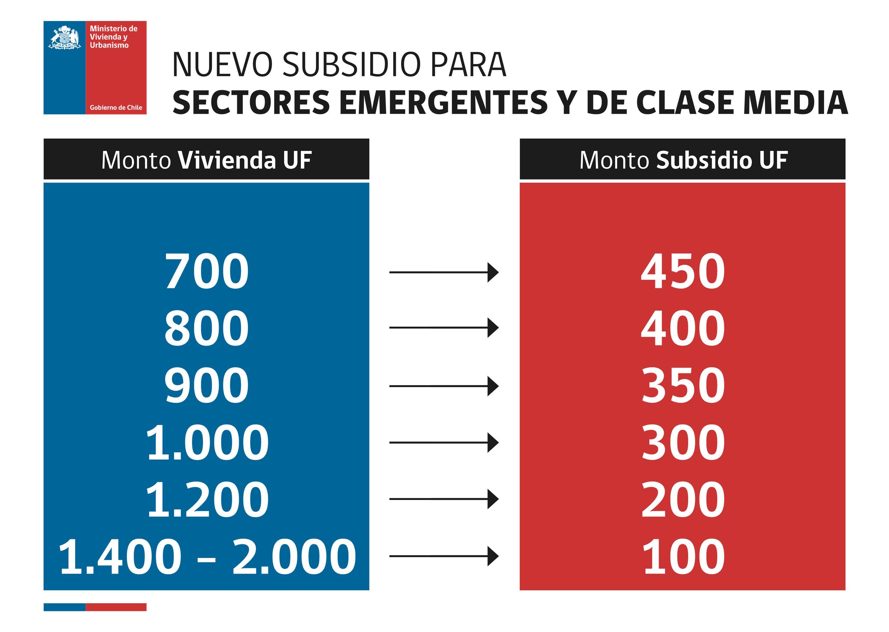 En tanto, para postular al subsidio destinado a Sectores Medios y adquirir viviendas de entre 1.000 y 2.000 UF, las familias deberán ahorrar un mínimo de 50 UF y no es requisito contar con Ficha de Protección Social. El monto del subsidio también es decreciente, entre 300 a 100 UF, dependiendo del precio de la vivienda.