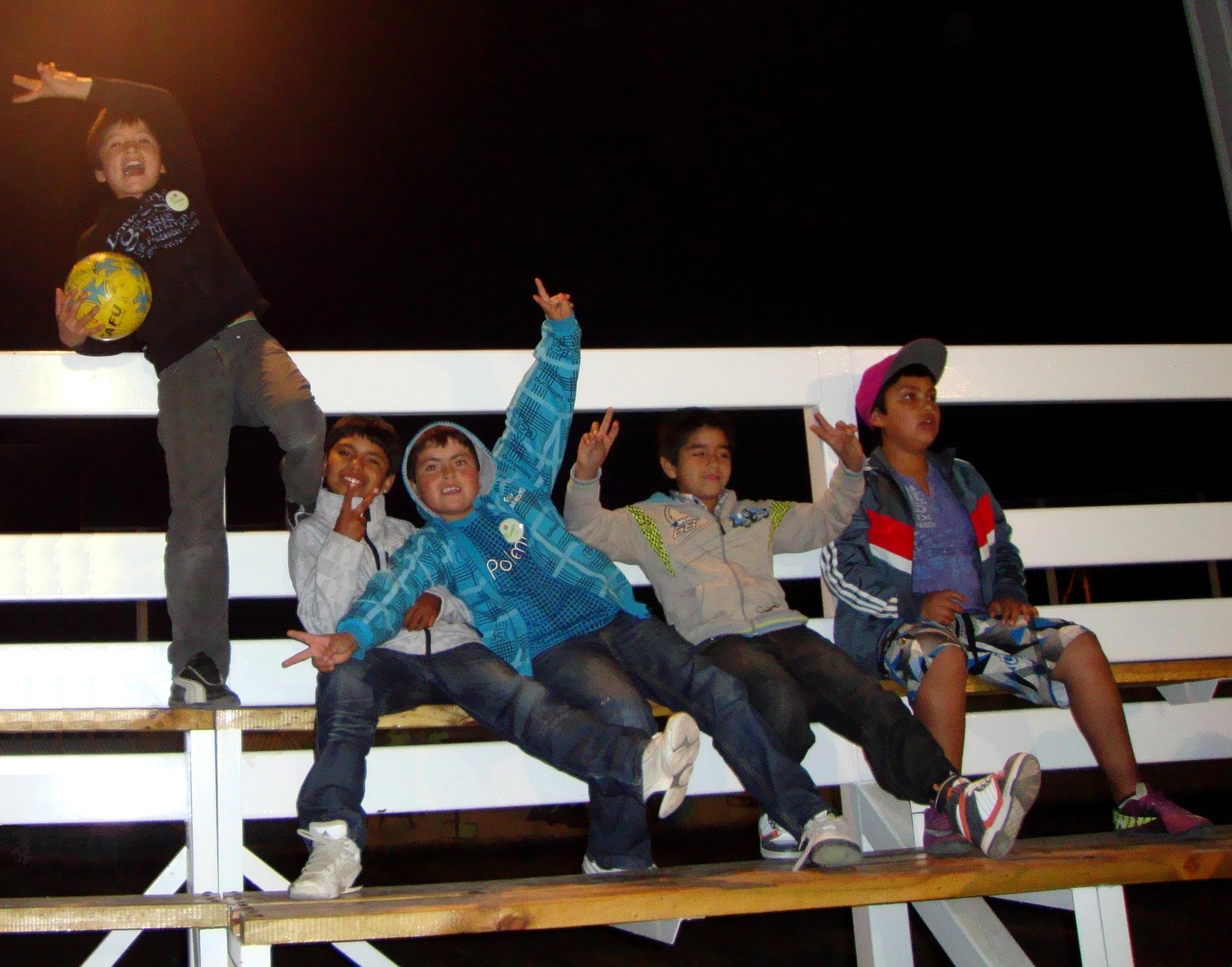 Pequeños espectadores disfrutan de un partido de fútbol en las nuevas graderías de la multicancha de Domeyko.
