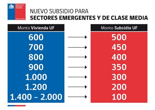 Los subsidios a sectores emergentes contemplan viviendas de entre 600 y 1.000 UF, que otorga un beneficio máximo de 500 UF. Por ejemplo, para viviendas de 600 UF, el subsidio será de 500 UF, de 700 UF el subsidio será de 450 UF; de 800 UF 400 UF en beneficios, y casas de 1.000 UF, el monto del subsidios será de 300. El ahorro mínimo para postular es de 30 UF.