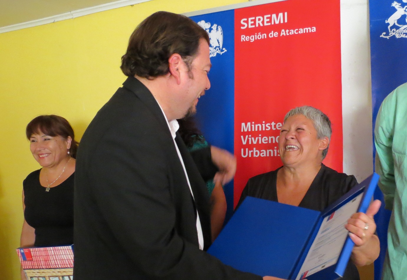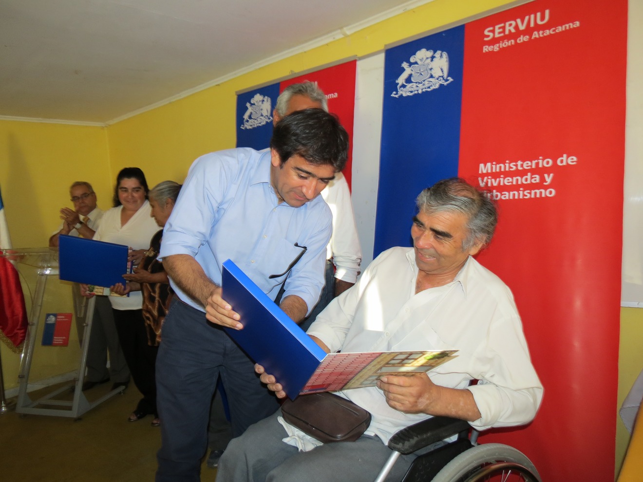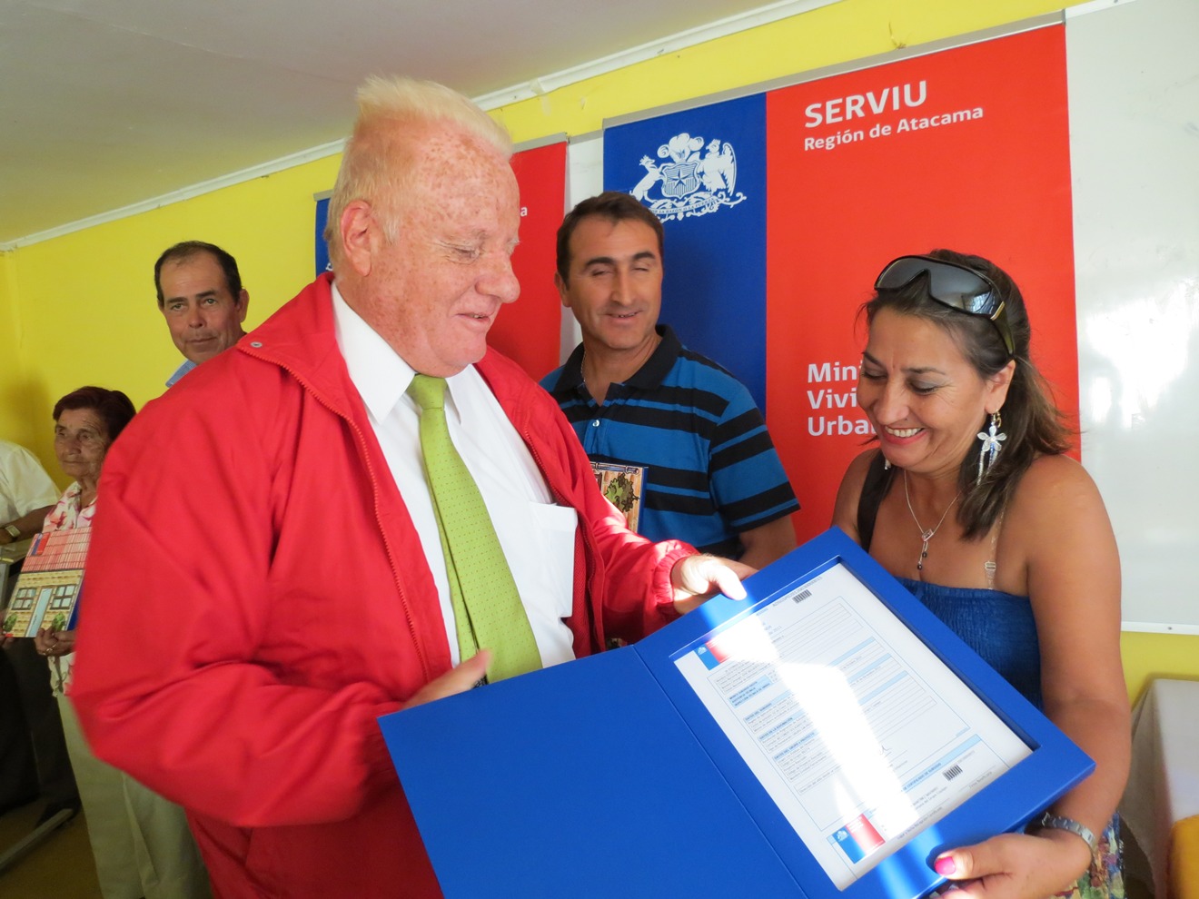 En la sede de la Junta de Vecinos Pablo Neruda, en Copiapó, se efectuó la ceremonia de entrega de certificados de subsidio habitacional del Fondo Solidario de Elección de Vivienda modalidad Construcción en Sitio Propio, asignados directamente por el Ministerio de Vivienda y Urbanismo a 15 familias del comité "Las Polillas del Desierto", cuyas casas fueron declaradas inhabitables por la acción de las termitas.