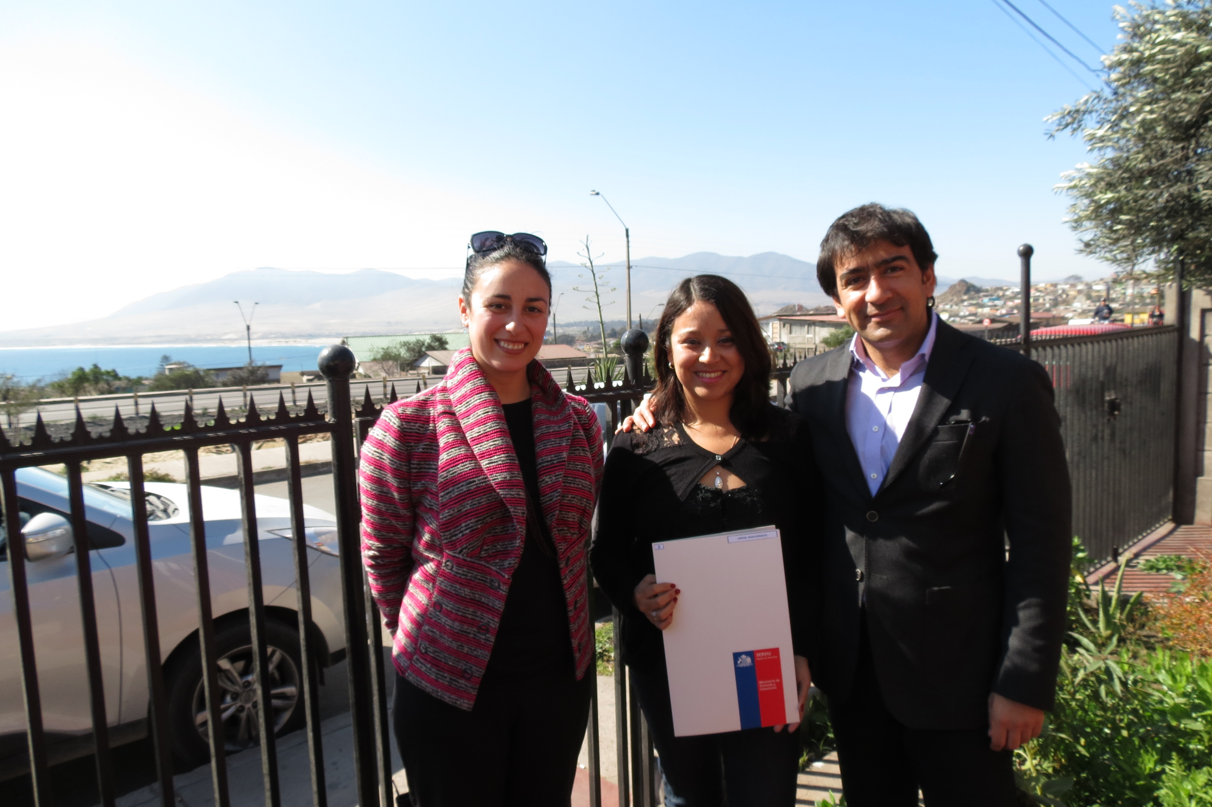 Paulina Vera Triviño, jefa del Departamento de Operaciones Habitacionales; Cinthia Rojas, beneficiaria de Huasco y Harry Lagunas, director de Serviu Atacama.