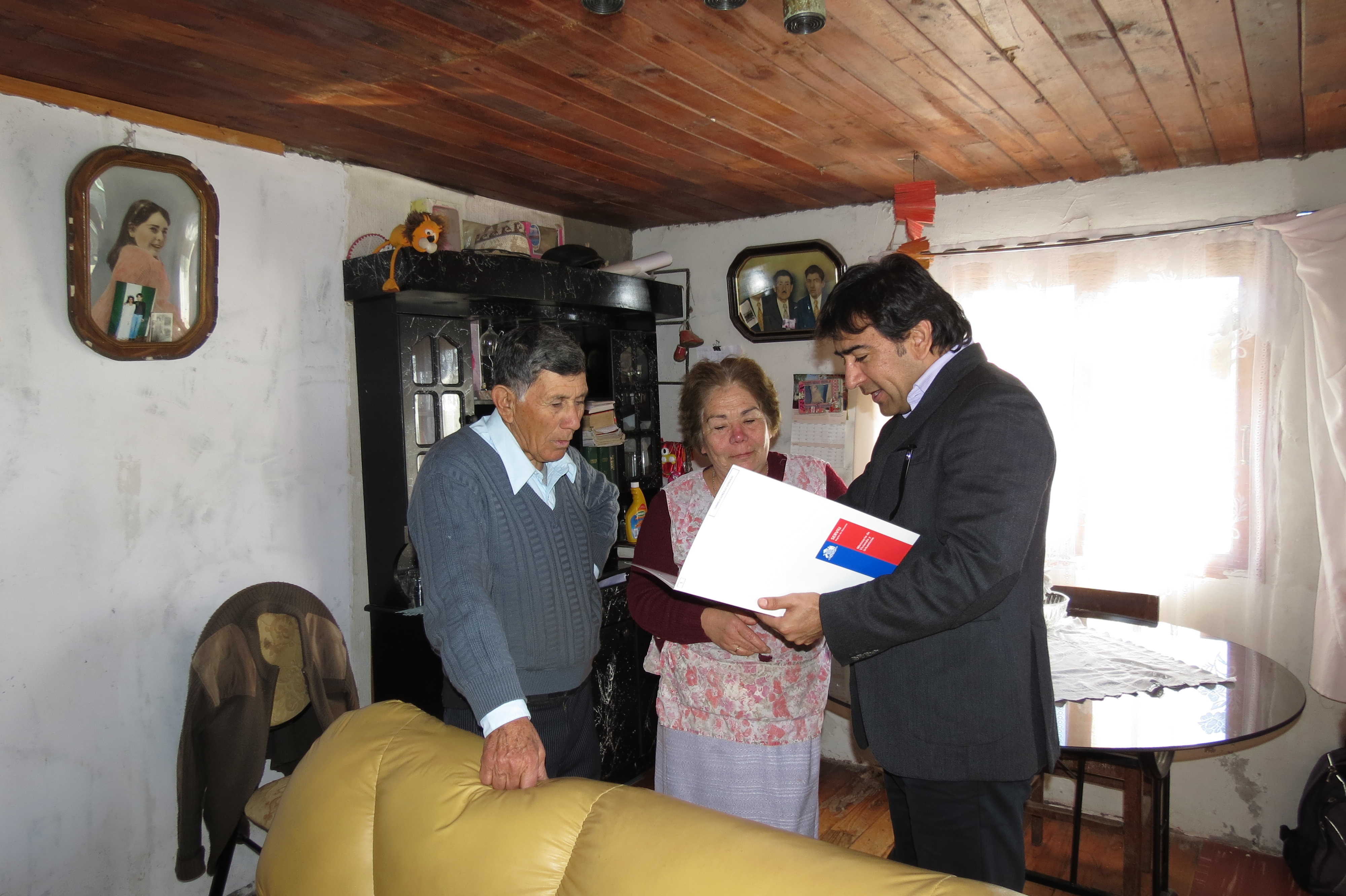 La señora Carmela González junto a su esposo, reciben su subsidio de manos del director en la localidad de Huasco Bajo.