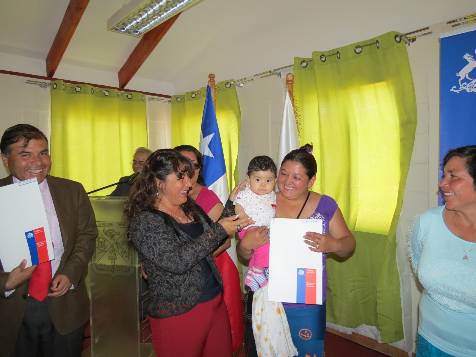 Beneficiaria Amleia Toro junto a su hija Valentina, Alcalde y concejala.