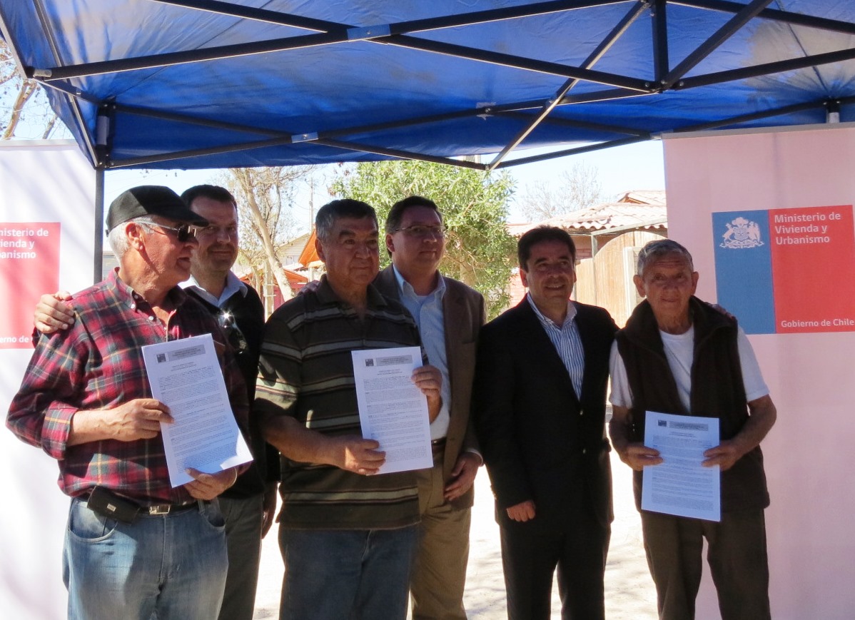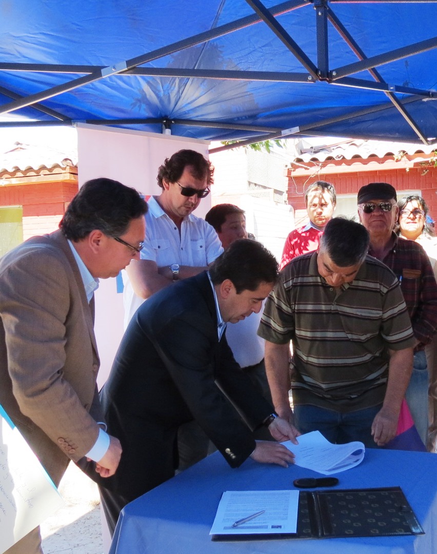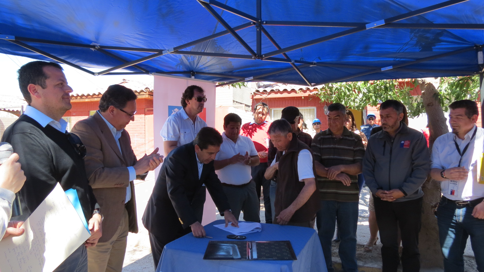 Las autoridades en compañía de los secretarios regionales ministeriales de Justicia, Bienes Nacionales y Energía; y la presidenta del comité de emergencia del sector María Angélica Lobos acompañaron a las familias que en el lugar firmaron los contratos de construcción trámite que formaliza el vínculo con la entidad patrocinante y el Serviu.