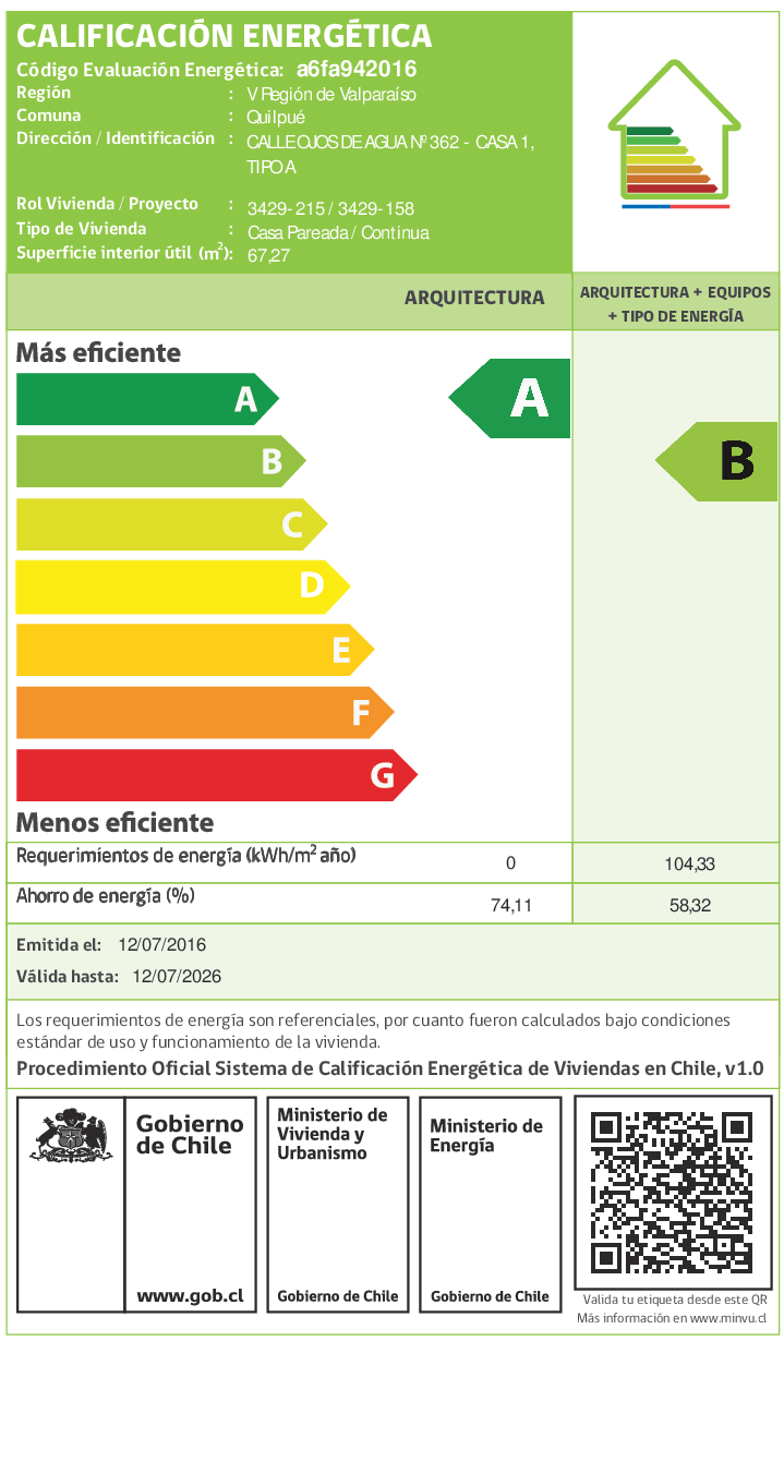 "En este contexto, es importante avanzar en el uso de instrumentos que sirvan para medir el desempeño energético de las viviendas, por lo cual, en conjunto con el Ministerio de Energía, desarrollamos la Calificación Energética de Viviendas, herramienta que permite evaluar y comparar, de manera objetiva, la eficiencia energética de las viviendas. Si bien hoy esta evaluación es voluntaria, y cada vez contamos con un mayor número de viviendas calificadas por la CEV, para nuestro ministerio es un desafío que el desempeño energético de las viviendas llegue a considerarse un elemento relevante a la hora de elegir un hogar, constituyéndose en un factor diferenciador, tal como ocurre en países desarrollados", señaló la ministra Saball.