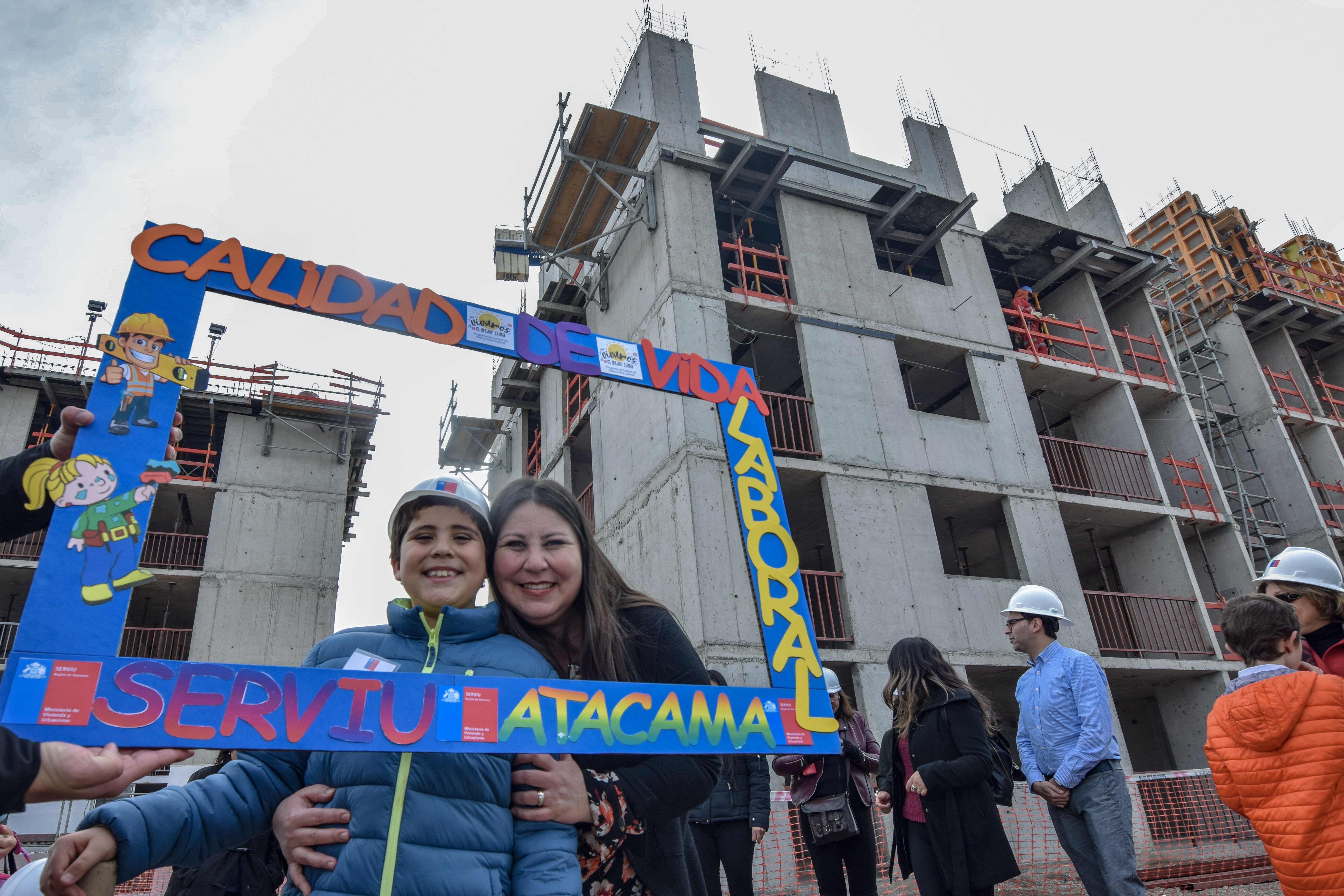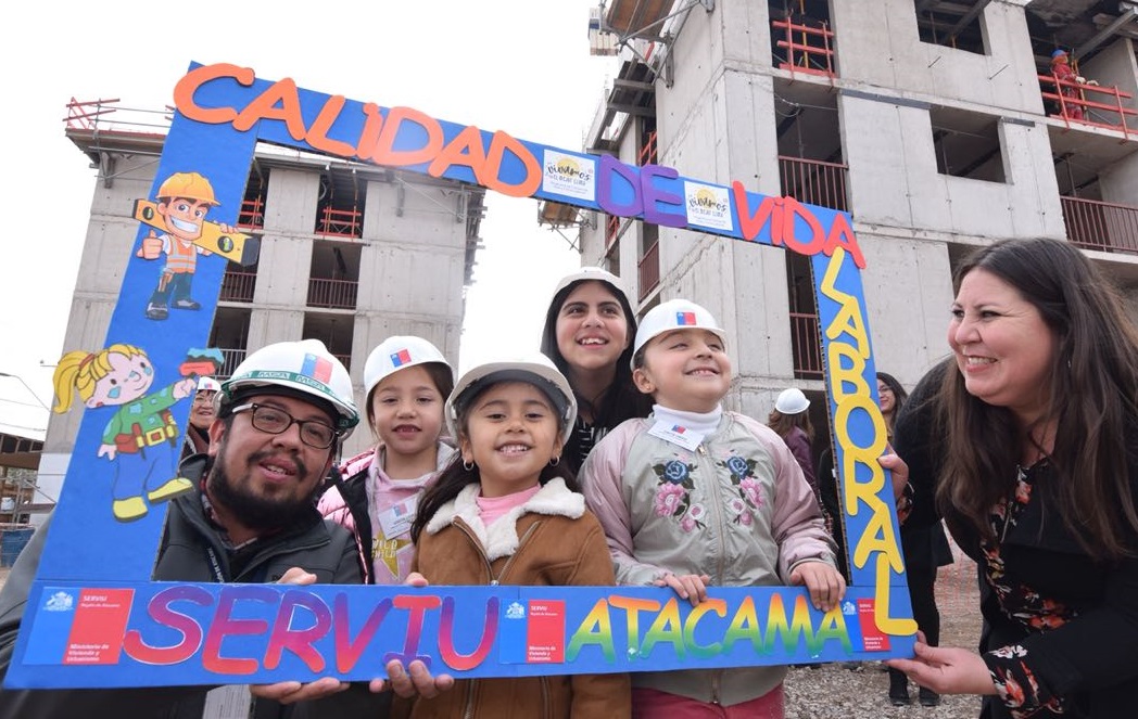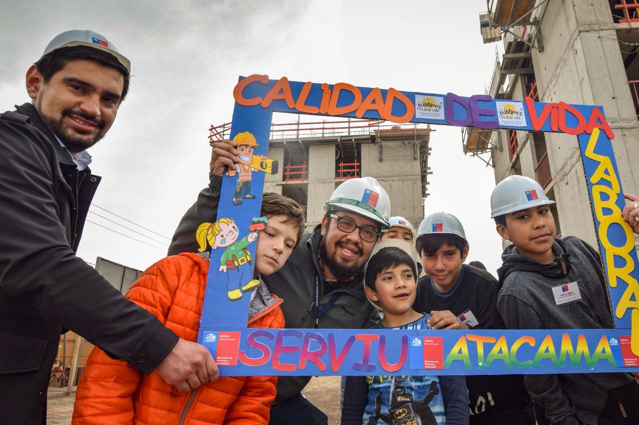 Una maravillosa jornada vivieron hijos y sobrinos de los funcionarios del Serviu Región de Atacama, durante la visita a obra del proyecto de 220 departamentos "Punta Negra Norte", en Copiapó; enmarcada en el Plan de Calidad de Vida Laboral, temática Conciliación de Vida Personal y Familiar con el Trabajo. Los pequeños pudieron conocer un poco más de las labores que se realizan en el Serviu Atacama al recorrer esta obra ejecutada por la empresa constructora LOGA y financiada el Ministerio de Vivienda y Urbanismo del Gobierno de Chile.