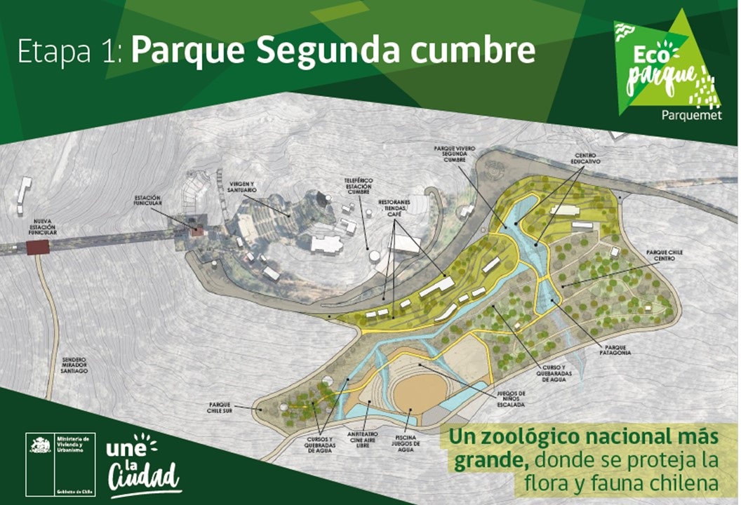 El EcoParque Metropolitano incluirá en una primera etapa una segunda cumbre que contará con un centro educativo, en el cual, mediante herramientas de realidad virtual, se busca promover el conocimiento sobre las especies nativas chilenas y que aportará aproximadamente 7.500 m2 de equipamiento urbano.