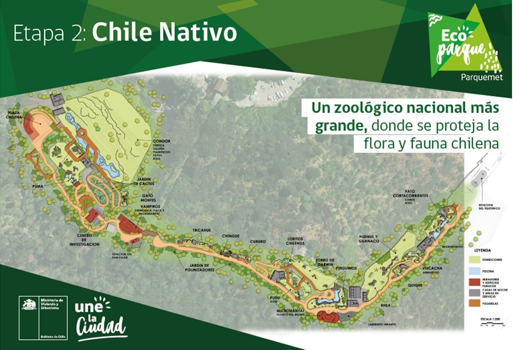 En una segunda etapa, se dará vida al Sendero América que conecta el actual Zoológico con el Chile Nativo. El sendero aventura incorporará puentes tibetanos, muros de escalada, y otros elementos paisajísticos, que aporten a la experiencia de los visitantes además de la exhibición de animales de América como tapires, jaguares y cocodrilos, entre otros. Chile Nativo que es una ampliación del Zoológico Metropolitano donde se exhibirán especies nativas chilenas, que entre sus principales atracciones tendrá un gran aviario de más de 4 mil m2 donde habrá cóndores, flamencos, patos y otras aves nativas. Además habrá un centro de investigación, jardín de polinizadores, y áreas o micro hábitat de las diferentes especies nativas chilenas.