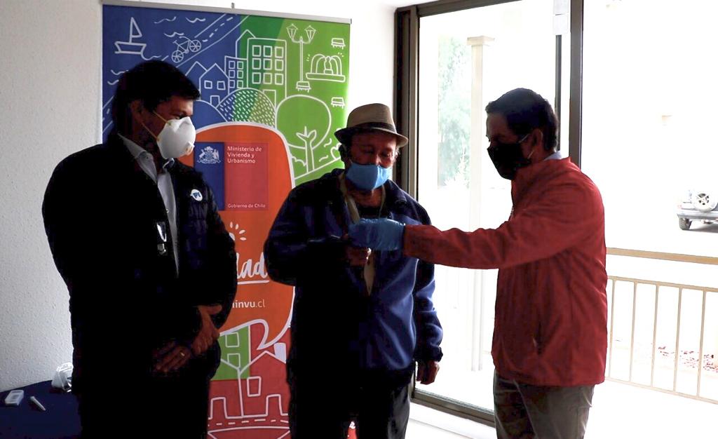 El Intendente de Atacama, Patricio Urquieta, felicitó por videollamada al primer beneficiario en recibir sus llaves, un adulto mayor de 73 años, René Alfaro Muñoz; a quien invitó "a formar parte de una nueva comunidad y ser buen vecino, para ayudarse en los momentos difíciles, como el que estamos viviendo hoy, separados pero unidos frente a la pandemia provocada por el Covid-19".
