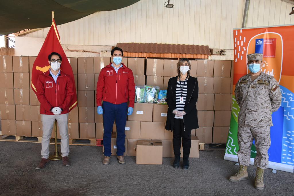 Gestión MINVU permitirá que 18 campamentos de las comunas de Copiapó, Vallenar, Tierra Amarilla y Huasco, reciban de manos del Gobierno de Chile útiles de aseo para apoyar medidas de prevención del Covid19. Entrega será coordinada entre dirigentes, autoridades y funcionarios del Ejército de Chile El Intendente de Atacama, Patricio Urquieta, junto a la Seremi (s) Minvu, Rocio Diaz, Seremi de Salud, Bastián Hermosilla y el General Enrique Heyermann recibieron 1600 kits sanitarios gestionados por el Ministerio de Vivienda y Urbanismo a través de la empresa privada Unilever para ir en ayuda de familias en situación de campamentos en todo Chile.