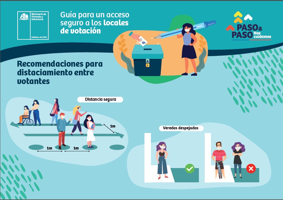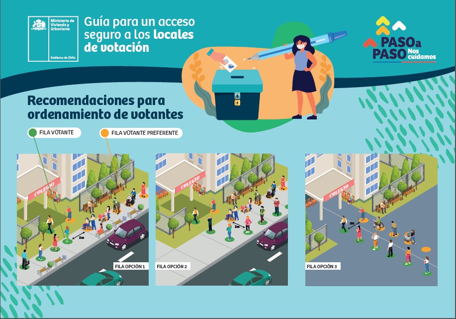 En este contexto, el Director del Serviu Atacama, Rodrigo Maturana Fuentes, destacó la importancia de respetar las recomendaciones sanitarias y de comportamiento en espacios exteriores "hoy, más que nunca, es necesario respetar el metro cuadrado del otro y mantener la distancia de, al menos un metro, entre personas; tanto en las filas para votantes como para votantes preferentes, de uso exclusivo para adultos mayores, enfermos crónicos, embarazadas, personas con discapacidad o movilidad reducida; durante la espera para ingresar al local de votación, no quedarse hablando por teléfono o conversando en el acceso a los locales de votación para evitar aglomeraciones y mantener las veredas despejadas exclusivamente para los peatones".