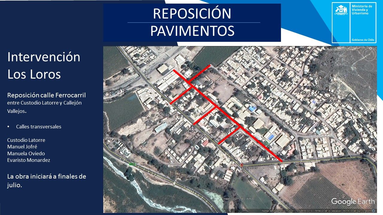 En la comuna de Tierra Amarilla, la reposición y mejoramiento se ejecutará en la localidad rural de Los Loros, más específicamente en Calle Ferrocarril y las transversales Custodio Latorre, Manuel Jofré, Manuela Oviedo y Evaristo Monardez.