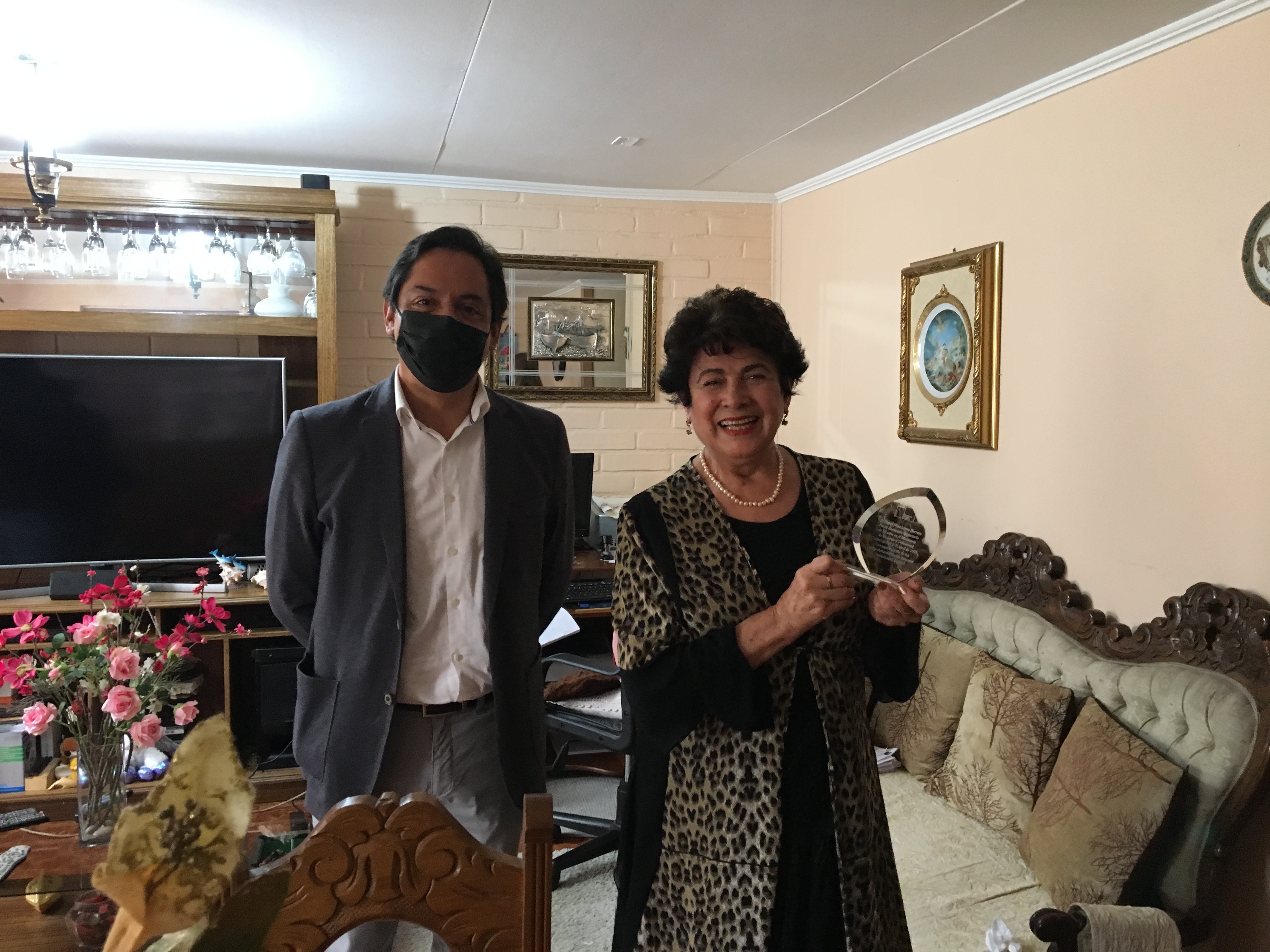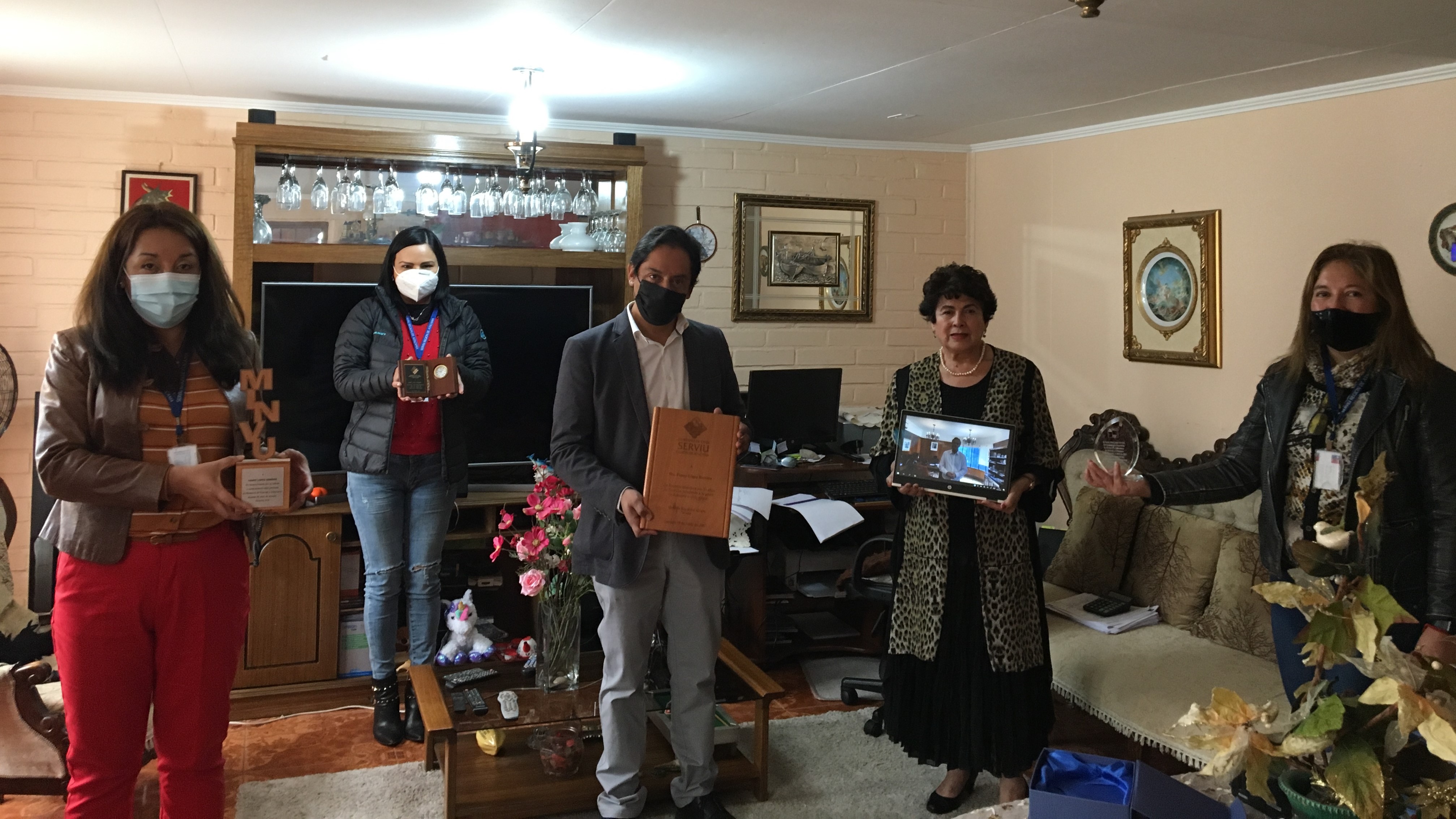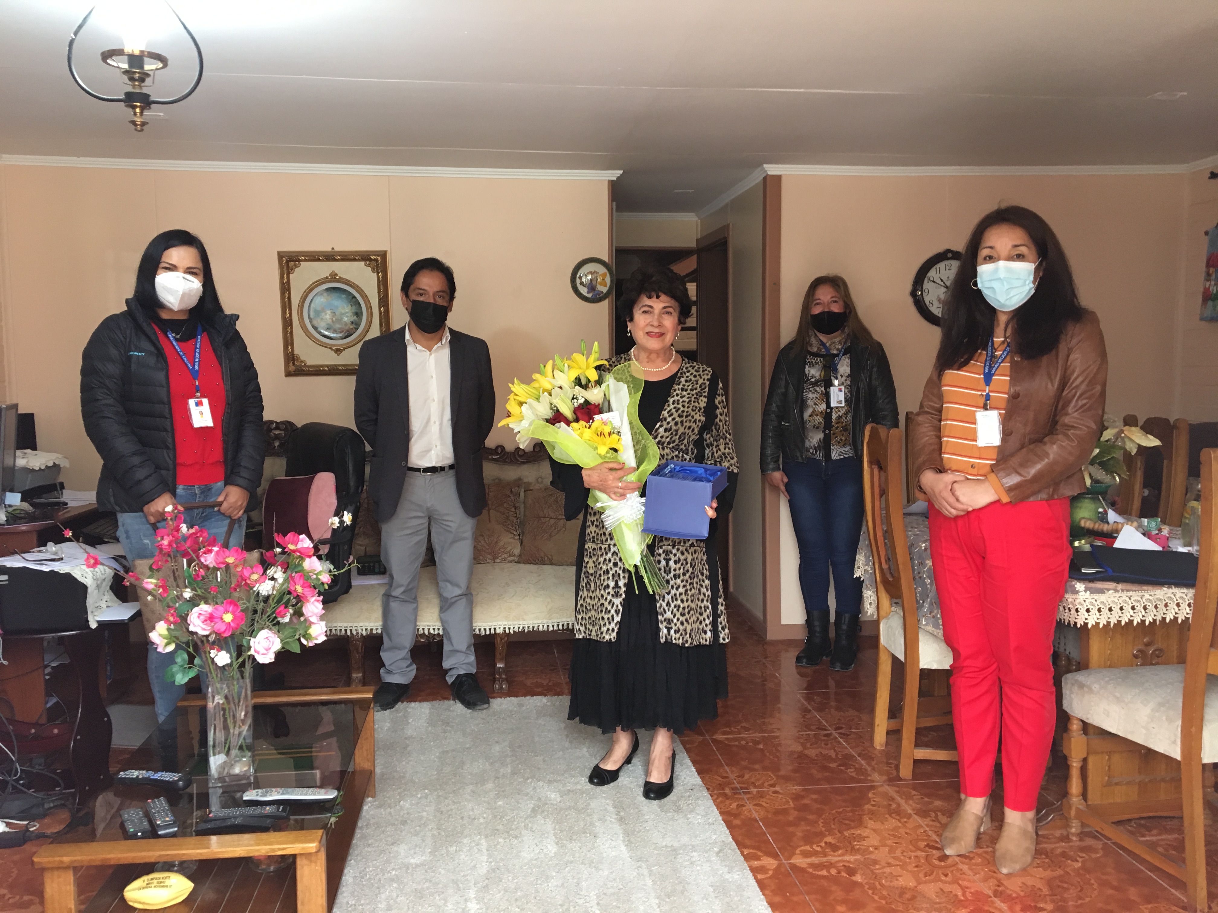 Debido a la contingencia sanitaria, el Director del Serviu Atacama, Rodrigo Maturana; la Jefa (S) de Administración y Finanzas, Joscelyn Cristi; la Encargada de la Unidad de Gestión y Desarrollo de Personas, Carmina Roco y la Presidenta de la Asociación de Funcionarios, Alejandra Cubillos; hicieron entrega, en su domicilio, de un reconocimiento a sus 50 años en el servicio público, un bouquet de flores y un video con el saludo del Ministro de Vivienda y Urbanismo, Felipe Ward.