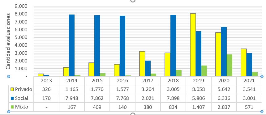 En los primeros años de operación fue necesario realizar importantes esfuerzos para instalar capacidades a lo largo del país y comunicar los atributos de la CEV a los mandantes de proyectos. Este trabajo se puede ver en el progreso de las evaluaciones de viviendas desarrolladas por inmobiliarias privadas, que, al principio, fue discreta, pero que en 2019 mostró una evolución muy significativa, sobrepasando el volumen de evaluaciones anuales históricas realizadas a viviendas sociales (ver gráfico).