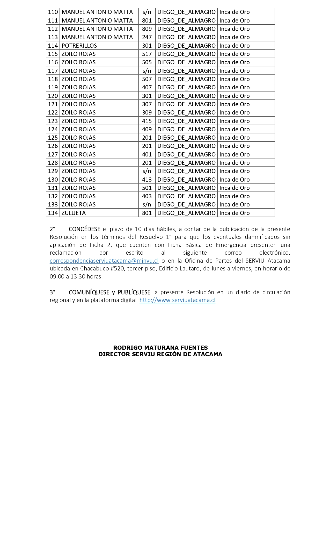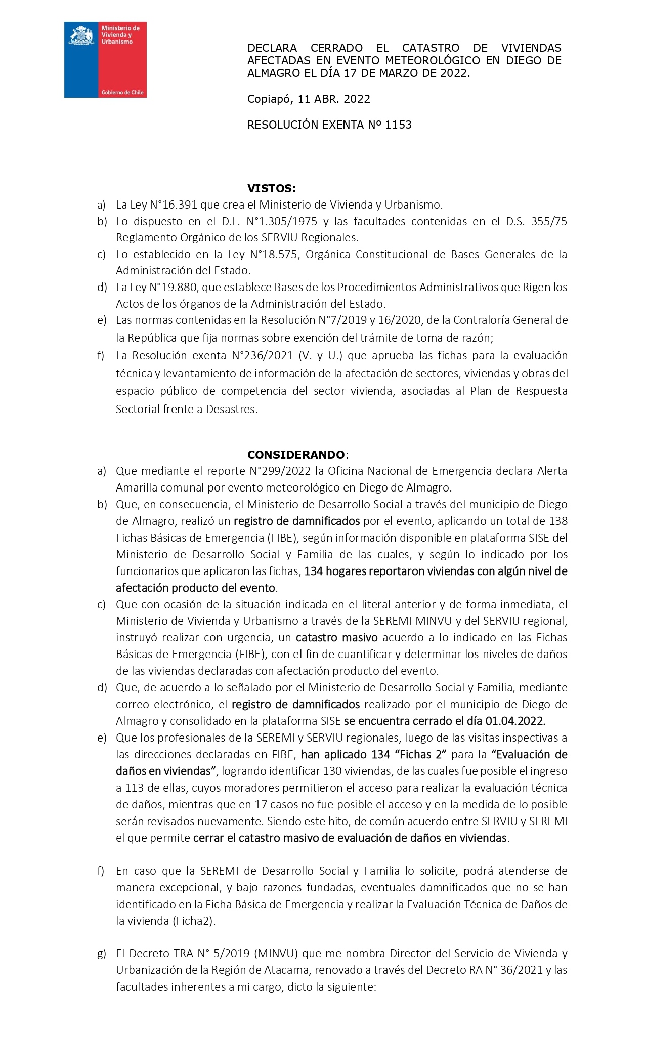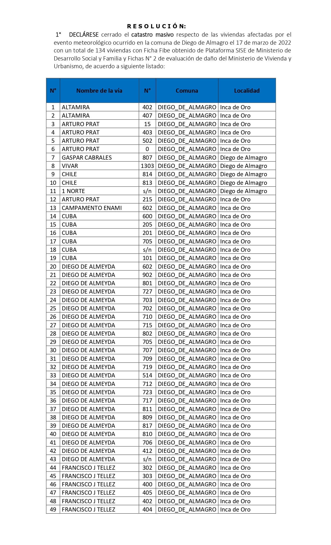 DECLARA CERRADO EL CATASTRO DE VIVIENDAS AFECTADAS EN EVENTO METEOROLÓGICO EN DIEGO DE ALMAGRO EL DÍA 17 DE MARZO DE 2022.