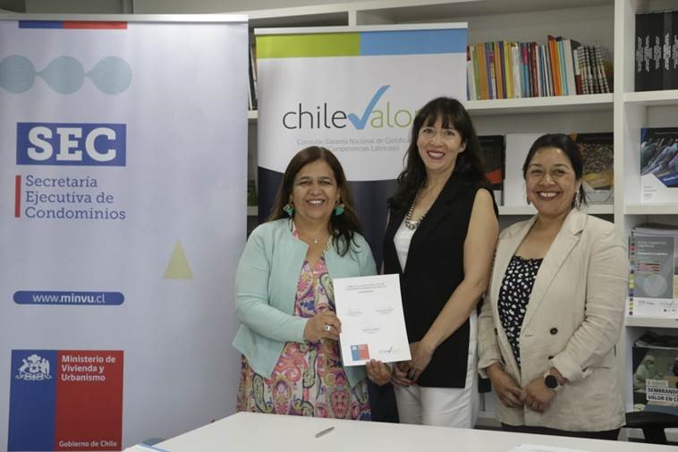 Santiago, miércoles 14 de diciembre 2022- . La subsecretaria de Vivienda y Urbanismo, Tatiana Rojas Leiva, junto a la encargada nacional de la Secretaría Ejecutiva de Condominios (SEC) del Minvu, Doris González Lemunao, y la secretaria ejecutiva de la Comisión del Sistema Nacional de Certificación de Competencias Laborales, ChileValora, Ximena Rivillo Oróstica, celebraron la firma de un convenio de colaboración que se enmarca en la implementación del Registro Nacional de Administradores de Condominios que impulsa este ministerio, y que es una de las innovaciones que introdujo la Nueva Ley de Copropiedad Inmobiliaria, N° 21.442.