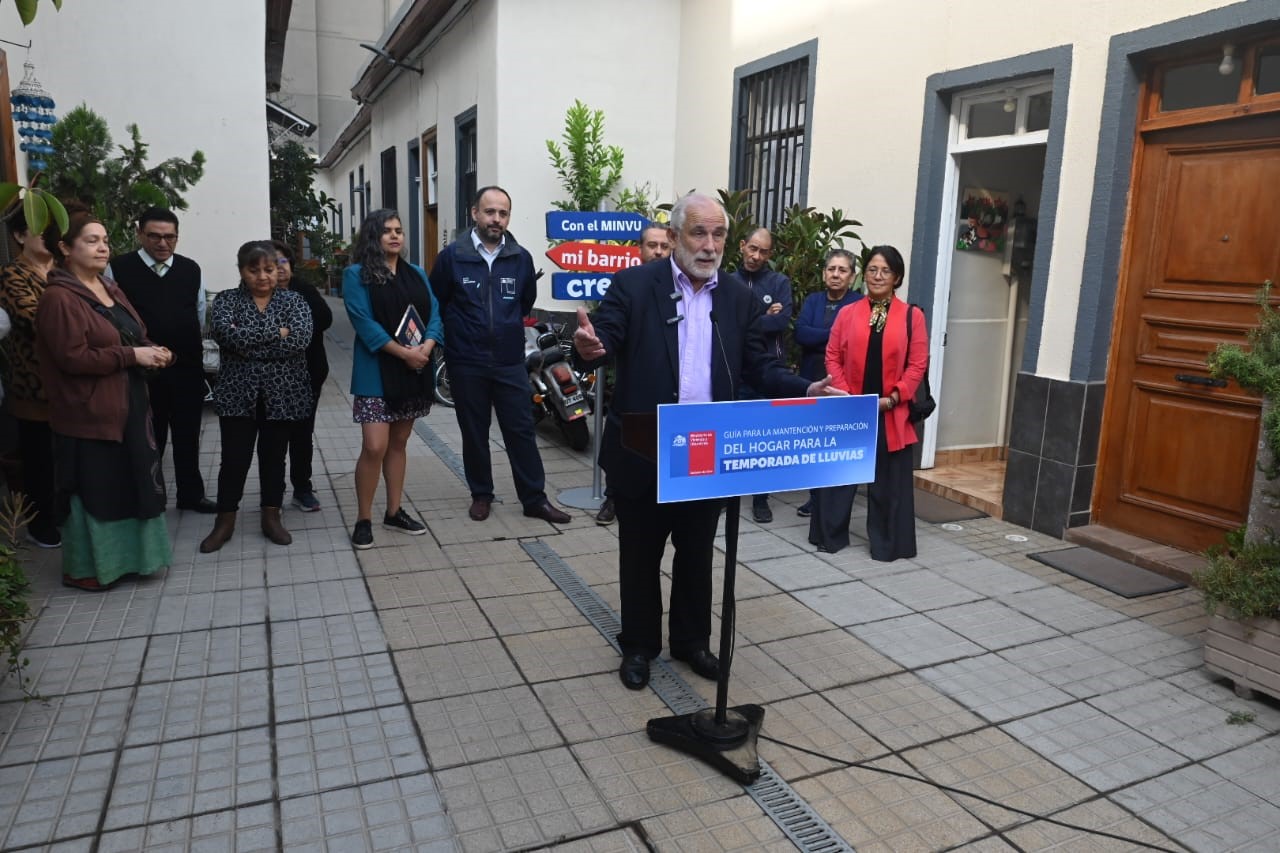 Viernes, 28 de marzo de 2025.- El ministro de Vivienda y Urbanismo, Carlos Montes, junto a la seremi de vivienda de la Región Metropolitana, Carolina Casanova, visitaron esta mañana a vecinos y vecinas del histórico cité "Claudio Gay" en la comuna de Santiago, oportunidad en la que presentaron la "Guía para la mantención y preparación del hogar para la temporada de lluvias", que contiene una serie de recomendaciones prácticas para implementar ante distintos fenómenos meteorológicos propios de esta época, como lluvias y temporales, tormentas eléctricas, fuertes vientos, cortes de luz asociados a caídas de árboles y postes, entre otros.