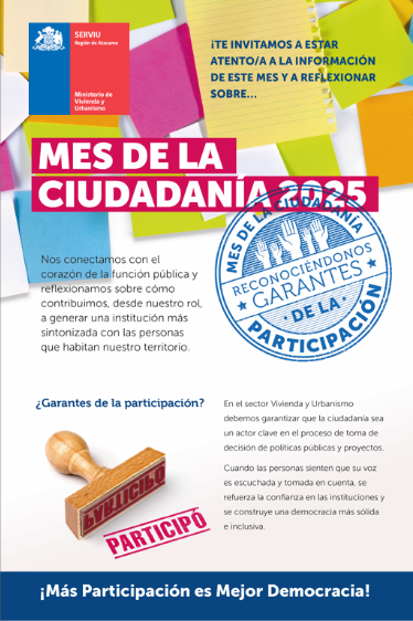 Estimados/as, junto con saludarles, informo a ustedes que nuestro Ministerio de Vivienda y Urbanismo, en el contexto del Mes de la Ciudadanía, campaña de sensibilización interna y de carácter nacional, busca promover la reflexión respecto de la función pública y la importancia de poner a las personas en el centro de nuestro trabajo, relevando el mandato establecido por el Plan de Emergencia Habitacional, y precisamente como proceso de modernización ministerial, nos invita a fortalecer y construir un nuevo vínculo con la ciudadanía.