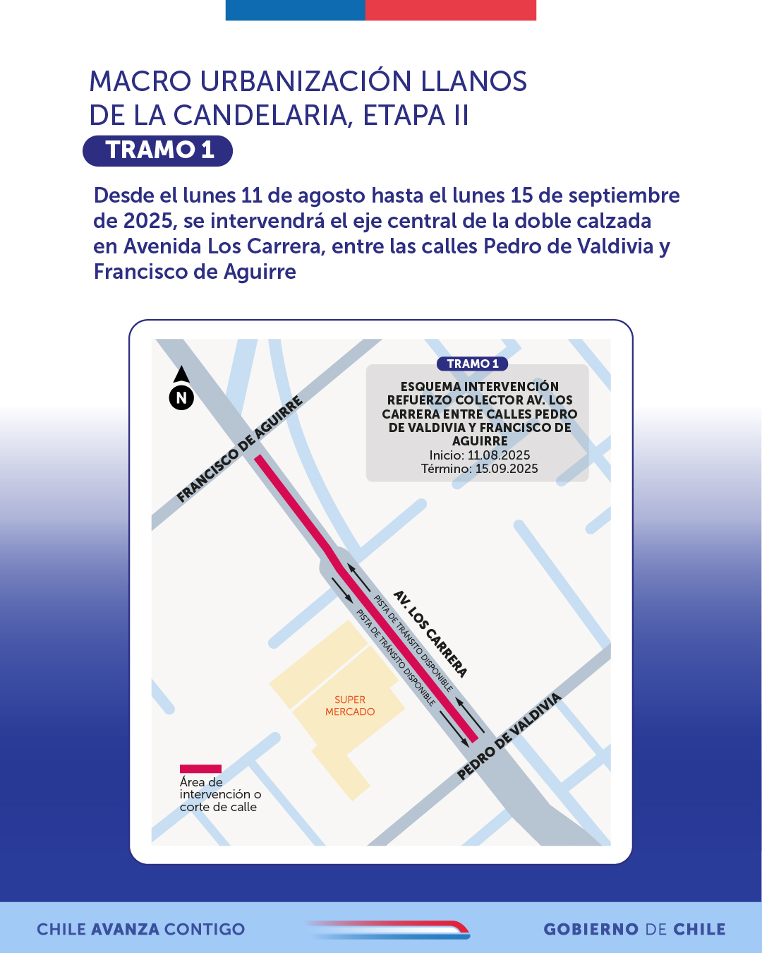 · Los trabajos del primer tramo, entre las calles Pedro de Valdivia y Francisco de Aguirre, comenzarán el lunes 11 de agosto de 2025 con la intervención del eje central de la doble calzada de Los Carrera; en el marco del proyecto "Macro urbanización Llanos de La Candelaria, Etapa II", en la comuna de Copiapó. El Ministerio de Vivienda y Urbanismo está ejecutando las obras del proyecto "Macro urbanización Llanos de La Candelaria, Etapa II", en una de las zonas de extensión urbana de la comuna de Copiapó. En este contexto, se contempla el refuerzo del colector de aguas servidas en la Avenida Los Carrera, entre las calles Pedro de Valdivia y Vicuña; mediante la instalación de una tubería de 630 mm de diámetro.
